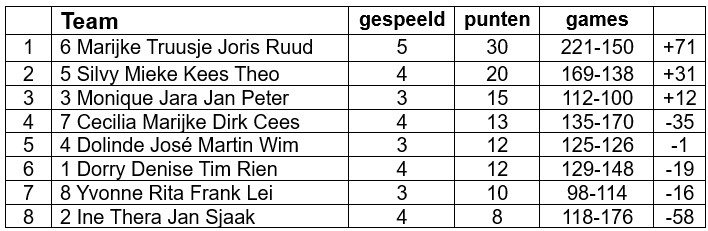Je kunt opgeven met een vaste partner, als je niemand kunt vinden proberen wij iemand hiervoor te zoeken, en wordt dan gekoppeld aan een ander stel waarmee je een team vormt. We proberen de teams zo gelijkwaardig mogelijk te maken zodat we leuke wedstrijden krijgen.