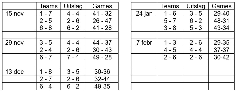 In november starten we weer met onze leuke interne mix competitie. We tennissen ongeveer 7 zaterdagmiddagen (14.00-16.30) van november tot in maart.