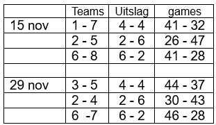 In november starten we weer met onze leuke interne mix competitie. We tennissen ongeveer 7 zaterdagmiddagen (14.00-16.30) van november tot in maart.